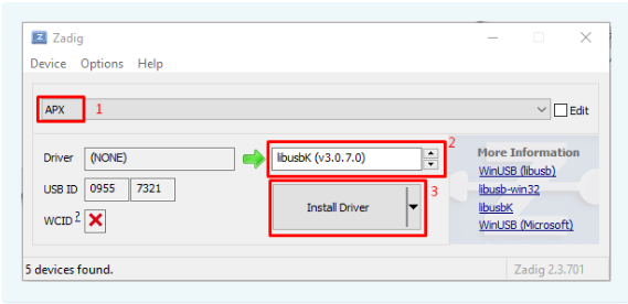 3). В поле “Driver” выберете libus (v3.07.0)